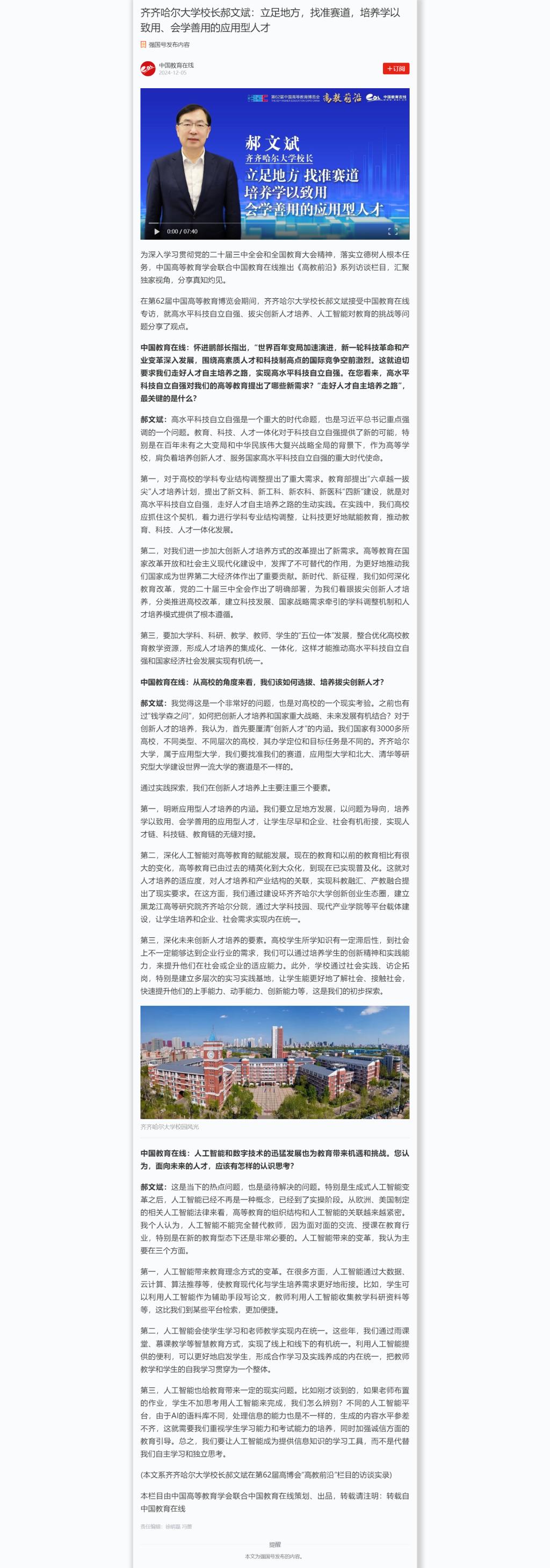 下一条:【人民日报-人民号】齐齐哈尔大学校长郝文斌:立足地方,找准赛道,培养学以致用、会学善用的应用型人才