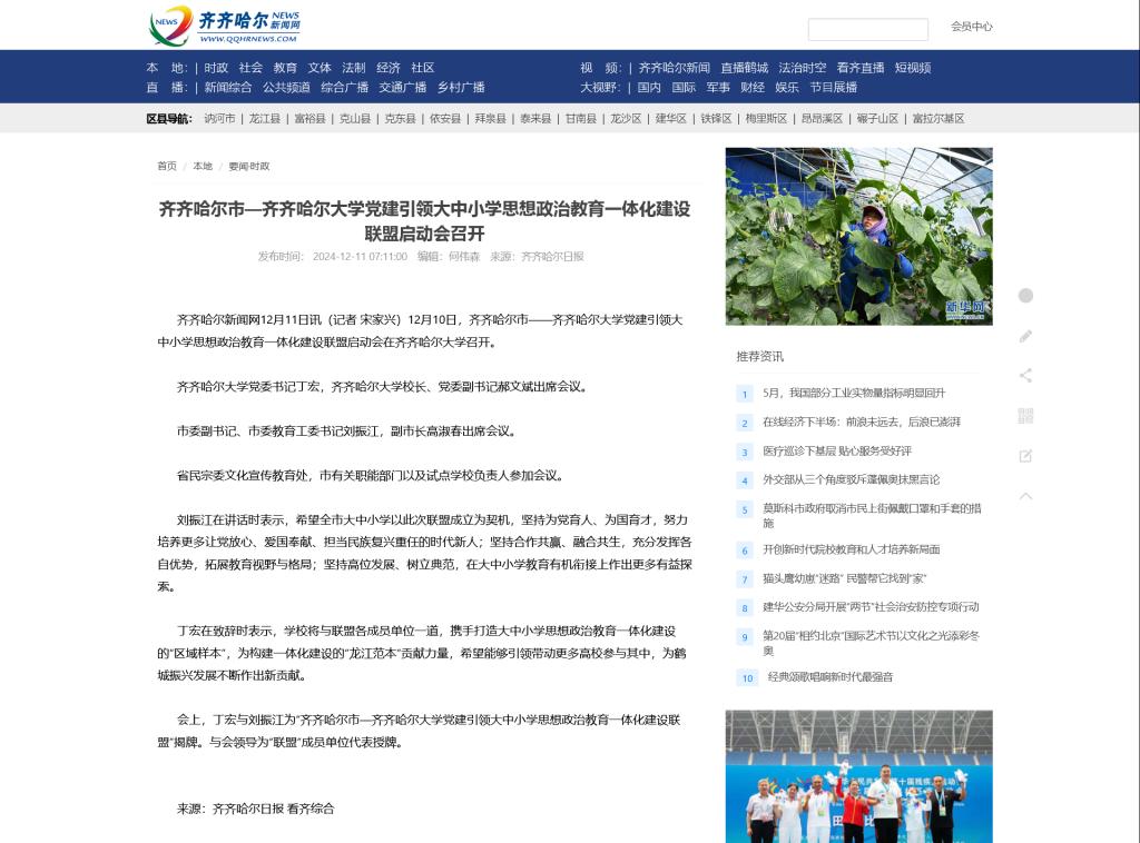 【齐齐哈尔新闻网】齐齐哈尔市―齐齐哈尔大学党建引领大中小学思想政治教育一体化建设联盟启动会召开