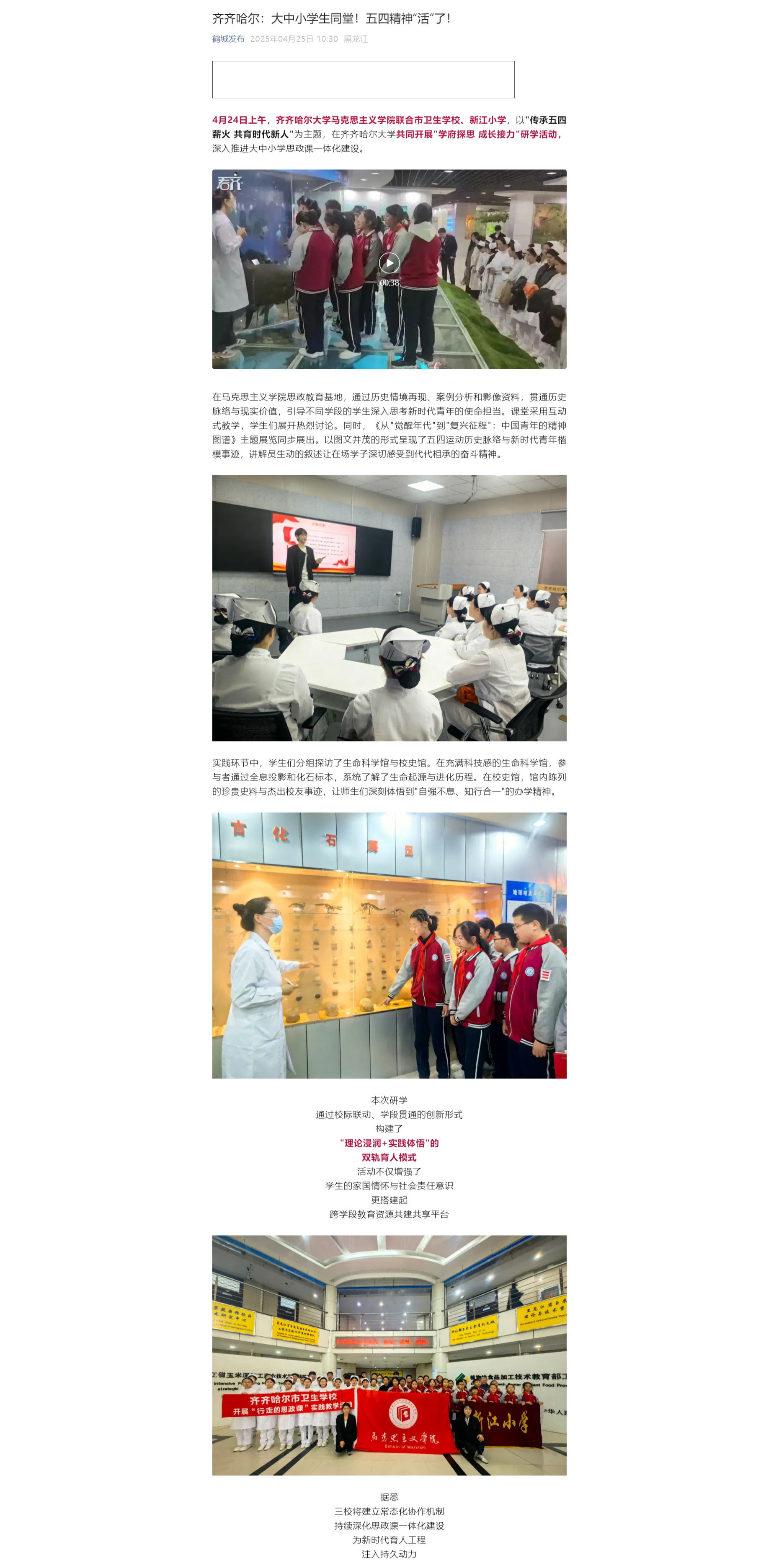 下一条:【黑龙江省高校思想政治工作网】齐齐哈尔大学美术与艺术设计学院与齐齐哈尔市铁锋区人民小学开展推进大中小学美育工作一体化建设座谈会