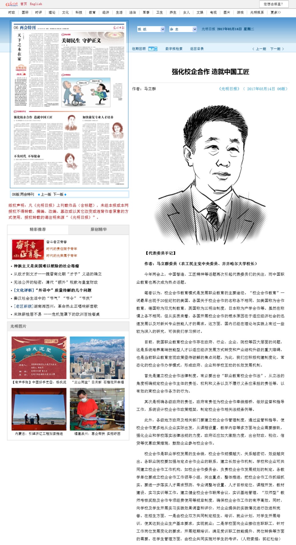 【光明日报】马立群:强化校企合作 造就中国工匠
