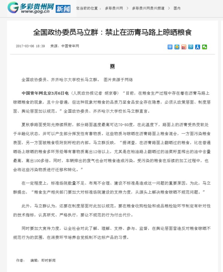 【多彩贵州网】全国政协委员马立群:禁止在沥青马路上晾晒粮食