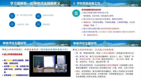 李英梅副院长以《本科教育教学审核评估——学院评建工作要点》为题,从新一轮审核评估的精髓要义、务实高效开展学院自评自建工作、审核评估过程与注意事项等三个方面进行详细阐述和指导。李英梅强调,本次审核评估与以往相比,更加注重教育的本质和立德树人根本任务。学院全体教师要提高认识,端正态度,不要为了评估而评估,而是要将其视为推动学院高质量发展的契机。她指出要深刻理解落实立德树人根本任务,学院层面要建立审核评估工作组织机构、明确任务分工,全院师生要提高参与本科教育教学审核评估工作的自觉意识和端正态度。最后在高质量撰写特色案例材料、高效梳理教学材料等方面做了精彩经验分享。