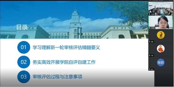 学院院长张剑飞在总结时表示,李英梅副院长的本科教育教学审核评估专题培训报告既有深刻理论,又有生动实例和具体经验做法,使学院全体教师详细了解审核评估的工作重点。学院将结合专家的宝贵意见,对标审核评估指标体系,认真梳理各环节关键要素,总结凝练学院本科教学的特色与亮点,正确面对存在的问题与不足,持续推进本科教育教学工作的高质量发展,实现以评促建、以评促改、以评促管、以评促强。