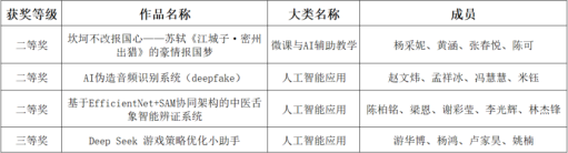 本届赛事设置软件应用与开发、微课与AI辅助教学、大数据应用等11个竞赛单元。赛前,我院精心组织了跨学科专业协同创新项目培育和遴选,依托华为ICT学院、IT极客社和大数据与人工智能能力提升等学生社团,组织校赛专家针对15份学生提交的作品进行评审,最终推荐Deep Seek 游戏策略优化小助手、AI伪造音频识别系统(deepfake)、基于EfficientNet+SAM协同架构的中医舌象智能辨证系统、坎坷不改报国心——苏轼《江城子·密州出猎》的豪情报国梦、古诗《声声慢》微课教学等5个作品参加省赛。我校学生经过现场答辩和路演以及评委评议,4个参赛作品获奖,获奖名单如下: