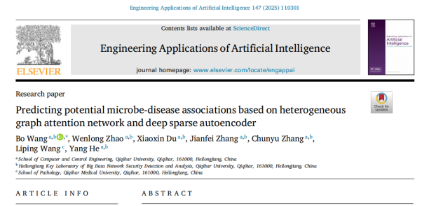 近日,我院王波教授团队在计算机科学领域人工智能TOP顶级期刊《Engineering Applications of Artificial Intelligence (EAAI)》(2025年中科院最新分区中计算机科学,中科院一区TOP,大类、小类双一区TOP,IF=8.0)上发表了关于人工智能大数据关联预测的重要研究成果,题为“Predicting potential microbe-disease associations based on heterogeneous graph attention network and deep sparse autoencoder”。该研究提出了一种基于图神经网络的深度学习框架GCDSAEMDA,旨在开发一种科学有效的计算模型预测潜在的微生物和疾病关联。王波教授为第一及通讯作者,团队成员赵文龙、杜晓昕、张剑飞、张春宇等共同参与了该研究。