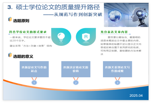 朱磊副院长从跨学科视角出发,深入剖析硕士学位论文质量提升的要点。她结合自身丰富的实例,详细阐述如何打破学科壁垒,融合多学科知识来深化论文研究深度。她还特别提到,论文选题要敏锐捕捉跨学科领域的前沿问题,参考文献也要阅读最新最前沿的文献,确保研究的创新性与实用性。