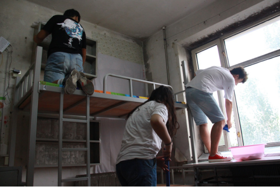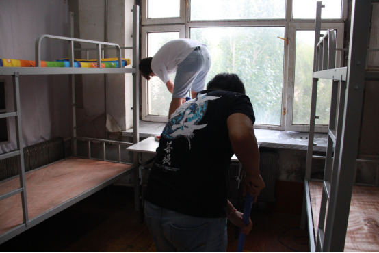 同学们依照分工带着工具来到分担寝室,认真擦拭桌椅玻璃、清理地面床铺,彻底清除门窗上的粘贴及锈迹。通过四天的打扫清理,寝室焕然一新。