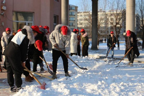 到达运建园社区后,全体志愿者帮助运建园社区的工作人员清理积雪。劳动中,大家不怕冷、不怕累,把每一个角落都清扫得干干净净。积雪清扫完毕,志愿者来到社区养老院看望老人们,陪老人聊天解闷,倾听老人们的心声。大家有说有笑,气氛和谐,欢声笑语、暖意融融。