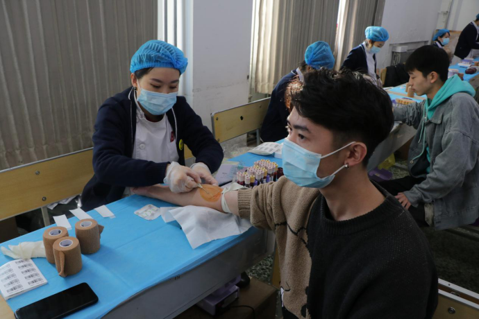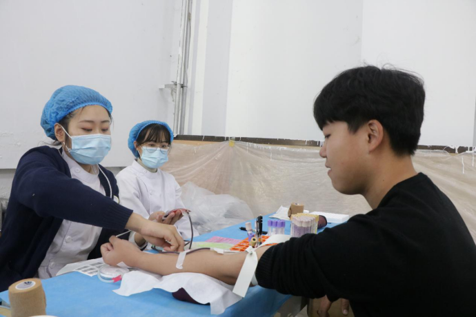 参加献血的学生带着献血注意事项表在学生干部的指引下依次体检、化验、抽血,现场井然有序。一名学生一边排队一边安慰身边第一次献血的室友,他说,“别紧张。我已经不是第一次献血了,自己的血液能够帮助有需要的人,我很高兴,而且适当献血有益身体健康。”