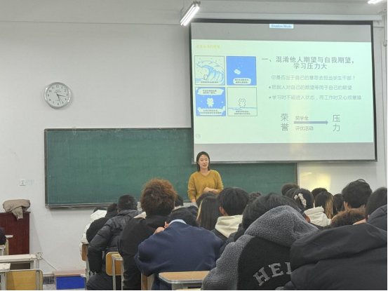 讲座中,吴方硕系统阐述了心理健康的基本概念与重要性,重点讲解大学生常见心理问题的识别与应对策略。通过生动的案例分析,演示情绪管理、压力疏导、人际交往等实用心理调适技巧,引导学生以科学的态度认识心理问题,掌握自我调节的有效方法。同时结合学校心理健康教育工作安排,详细说明心理健康筛查的意义与流程,鼓励学生积极参与筛查,主动关注自身心理状态,及时寻求专业支持与帮助。