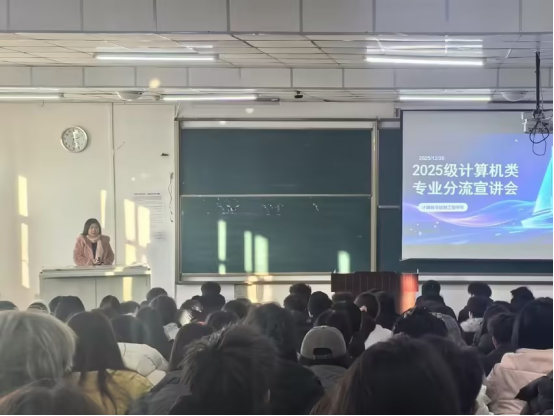 为做好2025级计算机类学生专业分流工作,引导学生科学规划学业发展,12月26日,我院召开2025级计算机类专业分流宣讲会。学院副院长于晓敏、计算机科学与技术系系主任王波、软件工程系系主任金涛和2025级计算机类全体学生参加会议。