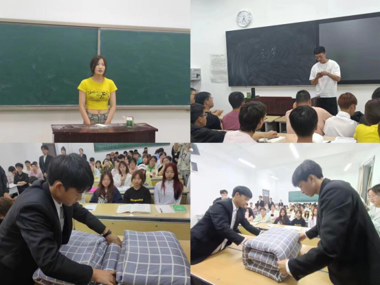 新生晚自习期间,由纪检部安排各专业教室并监察课堂纪律。28日,各班小班主任使用多媒体开展班会,并带领新生研习《学生手册》,了解校内各项规章制度。30日,由权益部带领学生示范整理内务,向新生示范叠“豆腐块”,提高宿舍内务整体标准,促进学生养成良好的生活习惯。