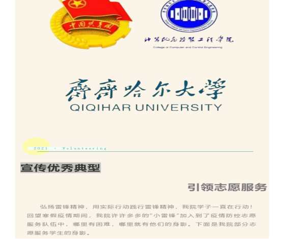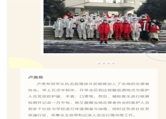 通过宣传优秀典型,更多青年学生看到志愿者们在疫情防控战线上的辛勤,看到他们用实际行动践行志愿服务精神,相信我们将会涌现出更多优秀的志愿者,继续弘扬志愿精神,在志愿服务中深刻体会“奉献、友爱、互助、进步”,用自己的青春与汗水为建党100周年献礼。