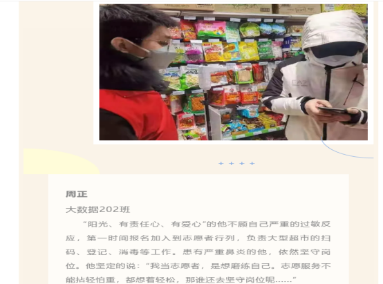 我院大数据202班周正,在富裕县疫情防控的一线默默坚守,负责大型超市的扫码、登记、消毒等工作,用志愿服务诠释着青春与担当。他的事迹被人民日报客户端“中国产业经济信息网”人民号、人民网-黑龙江、凤凰网、中经联播网、香港商报网纷纷报道。