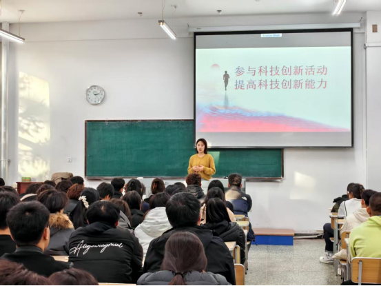 吴方硕围绕国家科技创新发展战略,引导学生深刻认识科技创新在国家发展全局中的核心地位,牢固树立“科学技术是第一生产力”的理念。她阐释了大学生参与科技创新的时代使命与个人成长价值,明确青年在科技强国建设中的责任担当。课上,吴方硕还介绍了“挑战杯”全国大学生系列科技学术竞赛等赛事的基本情况、参赛要求与备赛路径,为学生搭建清晰的参赛“导航图”,并结合国内高校共青团组织推动创新创业活动的成功案例,激发学生内在创新意识,凝聚投身科技实践的持久动力,助力学子将创新想法转化为实际行动。