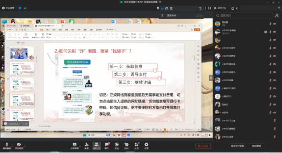 线上,各年级辅导员结合近期频繁发生的诈骗案例,讲解了常见刷单诈骗、非法借贷的各种诈骗模式,并从如何防范诈骗、识别诈骗等角度讲解了反诈的相关信息,提醒所有同学要切实提高反诈意识,杜绝侥幸思维,切实保护好人身财产安全。