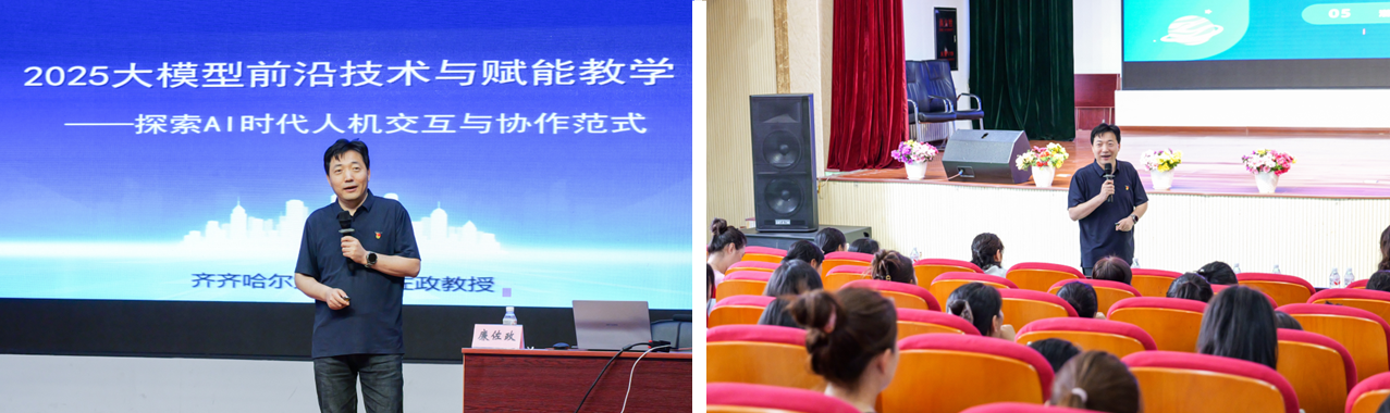 随后,廉佐政以线上线下相结合的方式,为全体支部成员作了题为《2025年大数据前沿技术与教学赋能实践》的专题讲座。讲座围绕人工智能的发展历程、大模型在教学中的实际应用以及未来教育数字化场景展望等多个维度展开,结合具体教学案例深入剖析了新技术对教育模式创新的推动作用,并分享了如何利用大模型技术有效提升课堂教学质量。现场交流互动热烈,反响良好。