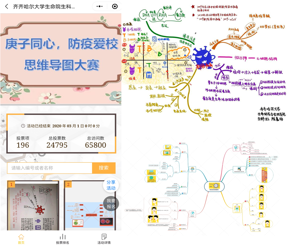 为帮助同学们了解新型冠状病毒的危害和疫情的严峻形势,提高同学们的预防意识,结合生物科学学科特点,通过网络投票的形式举办了“庚子同心,防疫爱校”思维导图和书法作品大赛,其中思维导图比赛针对2017和2018级生物科学专业学生展开,活动期间(2020年2月26日-3月1日)共有196名同学报名参加,总投票数为24795票,总访问量达65798次。全体2019级生物科学专业学生参加了书法作品比赛,从2020年2月18日上传作品,至3月1日活动结束,总投票人数为3343人,总票数达26071票。同学们参与活动热情高涨,作品内容紧紧围绕防范疫情,爱国爱校,通过活动激发了同学们学习的热情,缓解了紧张的情绪。全院教师也对积极参与此系列活动的评选,并对活动目的和作品内容大加赞赏。