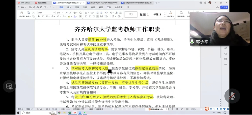为顺利完成本学期教学工作,安排布置期末考试工作,确保考试顺利,规范试卷资料存档,严明考试考场纪律,落实监考、巡考要求,12月21日19:30,我院线上召开了期末考试考务培训会,本次会议由教学副院长邓永平主持。