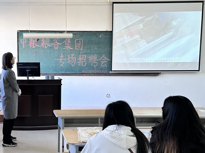 为深入实施就业优先战略,让我院应届生了解就业行情,明确就业的信心,充分发挥校园招聘主渠道作用。我院于2023年10月26日下午2点30分在延德楼330多媒体教室举办中粮粮谷集团专场招聘会。本次活动由中粮粮谷公司工作人员主讲,我院部分20级应届生参加此次活动。