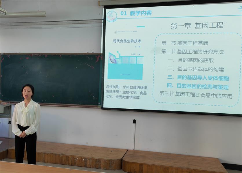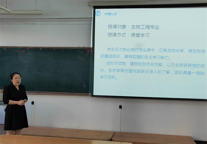 现场展示中,青年教师们饱含激情、循循善诱,以精彩的课堂设计、沉稳从容的讲授、师生间积极有效的互动设计赢得了评委的热烈掌声。食品科学与工程专业康佳欣老师讲授“基因工程的研究方法”,介绍了目的基因导入受体细胞的几种方式以后目的基因的检测和鉴定方法,积极调动学生参与课堂讨论;生物工程专业杨系玲老师向大家讲述了普通植物学中的顶端优势,深入浅出,现场效果良好。