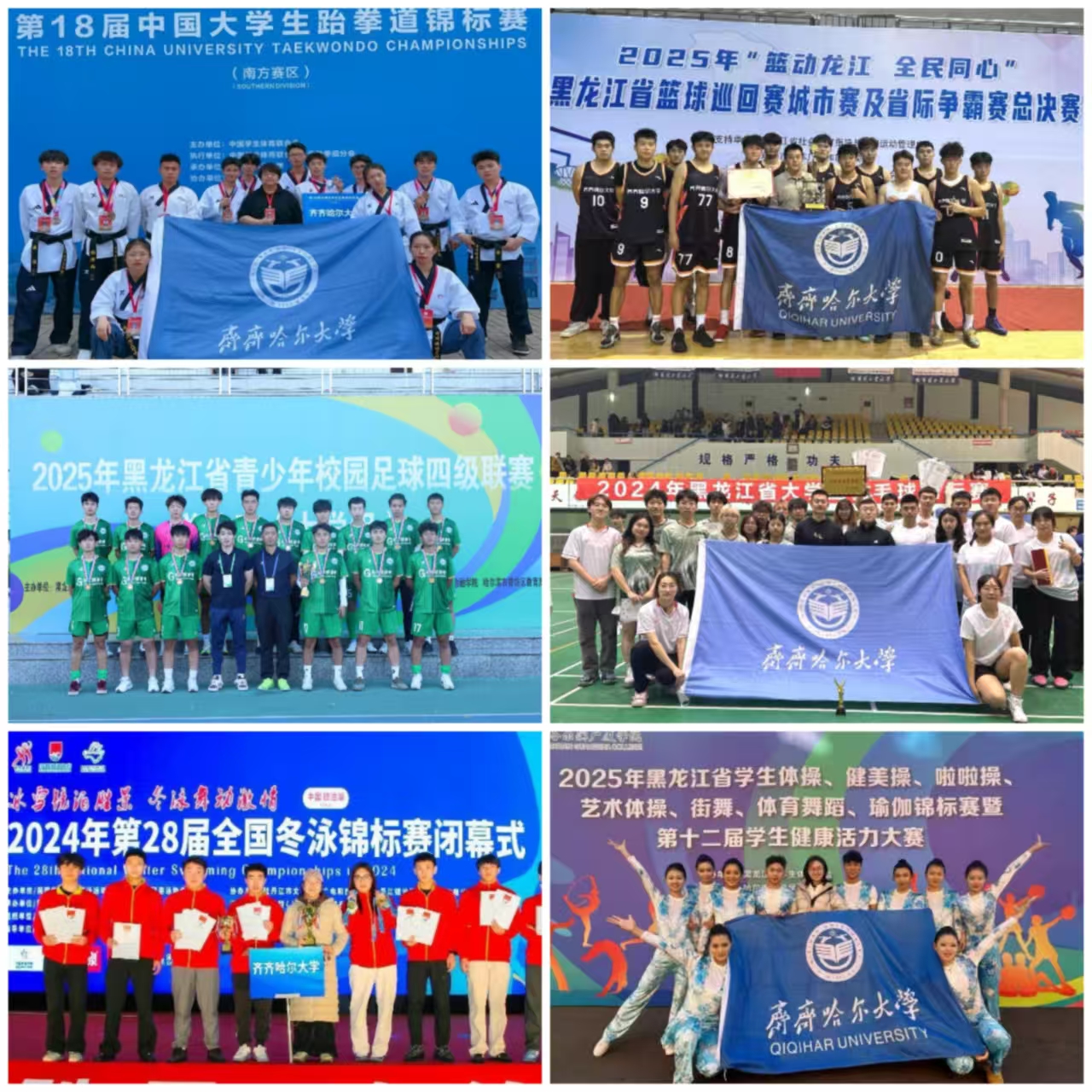 学院内涵建设成效显著,2011年体育教育专业获批省级重点专业,2022年2个专业获批校级一流专业,1门课程获批省级一流本科课程。学院坚持“健康第一”教育理念,持续深化大学体育教育改革,创新体育教育模式,全面提升学生身体素质与综合素养。常年开展丰富多彩的校园体育赛事,坚持举办全校运动会、篮球联赛、足球联赛、羽毛球赛等群众性体育活动,营造“人人参与、人人健康、人人出彩”的浓厚体育氛围。通过“以赛促练、以赛育人”,不断提升学生身体素质和竞技水平。学生体质健康测试达标率显著提升,体育育人成效持续显现。1名教师获2025年亚洲铁人三项锦标赛分龄组冠军。学院2名教师参与北京冬奥会执裁工作,3人参与2025年哈尔滨亚冬会执裁工作;学生11人次在中俄大学生冰球友谊赛中荣获优秀奖,146人次获得国家级体育赛事奖项,229人次获省级荣誉。学院被教育部授予贯彻“学校体育条例”优秀高校、省级“百万青少年上冰雪”先进集体等,齐齐哈尔大学国民体质监测与健身指导服务(姚大为)工作室获市劳模创新工作室称号,被黑龙江省雪上训练中心聘为医疗保障团队。